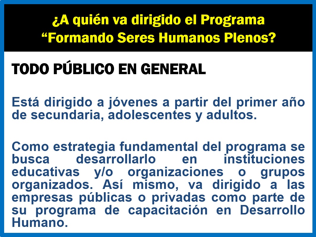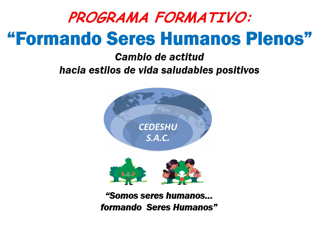 El programa “Formando Seres Humanos Plenos” difunde y promociona aspectos sustanciales tanto de La Declaración Universal de los Derechos Humanos como de La Carta de la Tierra Perú, y fundamentalmente profundiza aspectos que los complementa y estimula a que los cambios sean sostenibles y permanentes.